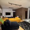 Livingul impresionează prin designul contemporan, fiind mobilat cu o canapea colțar în culori vibrante, ce contrastează elegant cu peretele decorat cu marmură albă și finisaje din lemn natural. Accentele negre și aurii completează atmosfera sofisticată.